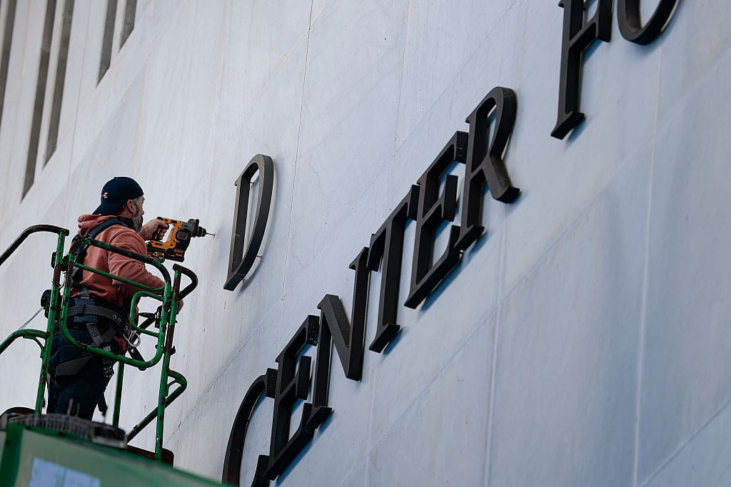 Workers begin adjusting the name of the “John F. Kennedy Memorial Center for the Performing Arts” on Dec. 19, 2025 in Washington, D.C. to add President Donald Trump to its signage. (Heather Diehl/Getty Images)